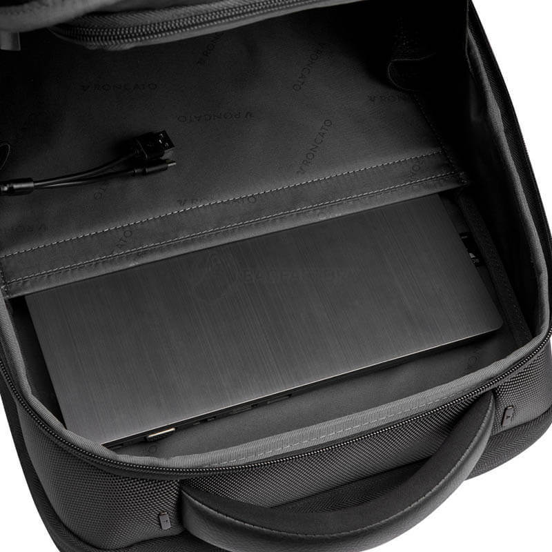 Рюкзак виготовлений з еко-шкіри та щільного балістичного нейлону, з акцентом на функціональність. Оснащений двома основними відділами на блискавці, в яких є можливість розмістити ноутбук, планшет, смартфон, пишучі предмети та ще необхідні Вам речі. З зовнішнього боку рюкзака, розміщені невеликі кишені для речей першої необхідності. Задня частина виробу оснащена маленькою кишенею на блискавці, ортопедичною спинкою, мʼякими плечовими ременями та розумним рукавом для кріплення на телескопічній ручці валізи. Також, має бокові кишені, одна з яких обладнана USB-портом для підзаряду Ваших електронних пристроїв.