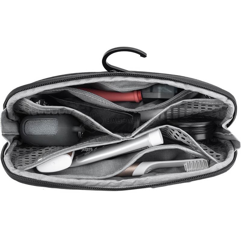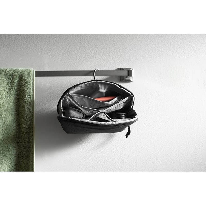 Сумка стійко стоїть на поверхні або може підвішуватись за складний алюмінієвий гачок. Всередині – система кишень із сітки з нейлону з покриттям TPU, внутрішня кишеня на блискавці та магнітна кишеня для зубної щітки, які допомагають зберігати речі чистими та впорядкованими. Усі кишені можна вивернути для глибокого очищення у разі протікання. Зовні – додаткова кишеня на блискавці для бритви чи інших дрібниць.